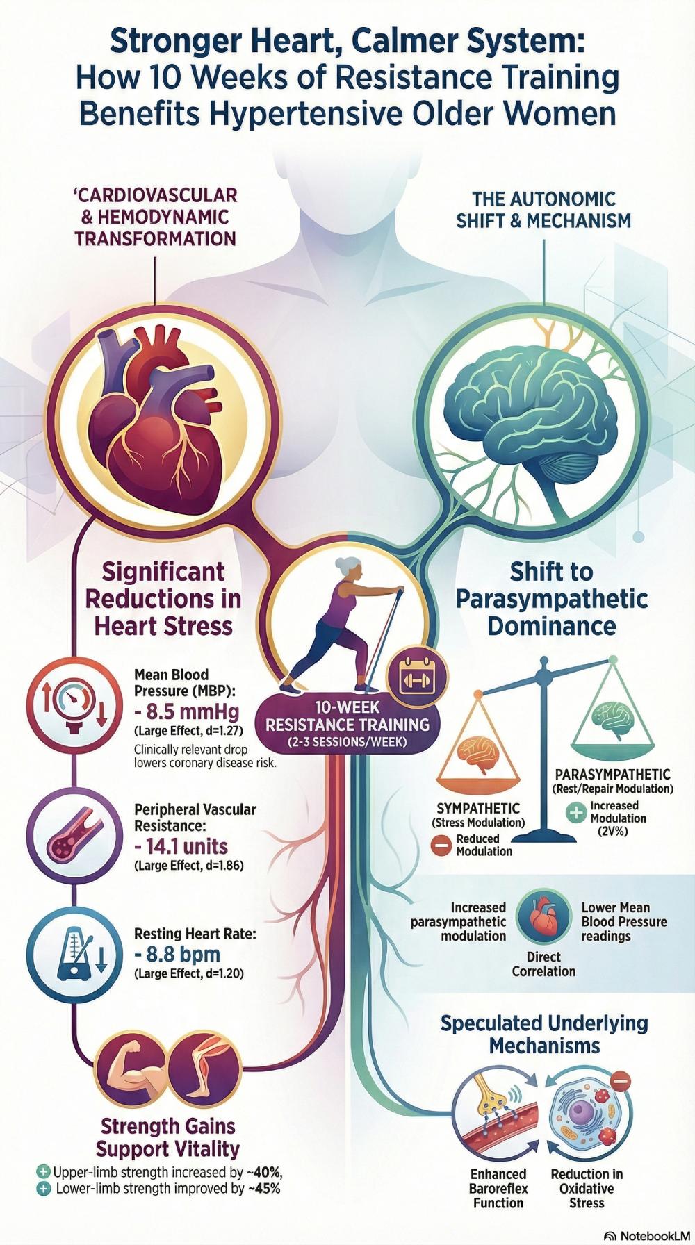 A study on hypertensive older women—who typically have high sympathetic activity—found that just 10 weeks of resistance training successfully pushed their nervous systems into a more balanced state (which offers total-body benefits). AI made me a nice infographic to summarise: